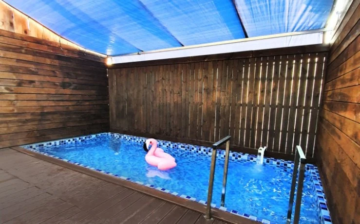 개별 테라스에서는 따끈따끈한 온수 수영도 즐길 수 있다. 30도로 온도가 유지되며, 별도의 온수 추가 비용이 없이 무료로 이용 가능하다! 야외 테라스지만 천장이 막혀있어 비가 와도 걱정 없다.