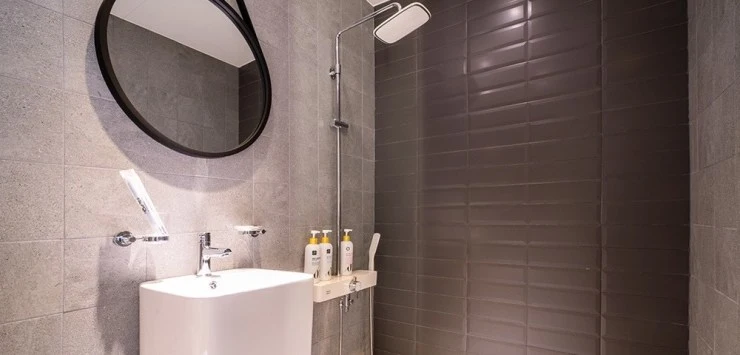 저절로 셀카 찍고 싶어지는 예쁜 인테리어의 욕실! 어메니티로는 샴푸, 린스, 바디워시, 비누, 치약, 수건, 드라이기가 비치되어 있어요. 칫솔과 클렌징폼 정도만 챙겨오면 된다.