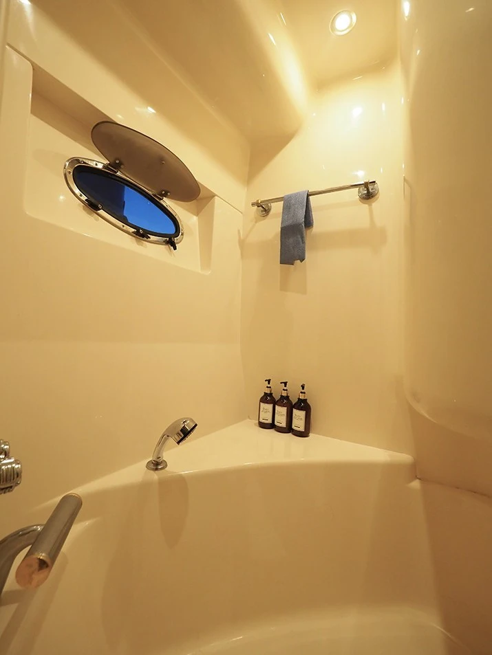 요트 내에는 샤워실과 화장실, 욕조까지 모두 설치되어 있다. 화장실, 샤워실도 2개, 어메니티까지 구비돼 있어 편리하다.