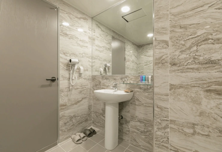비품은 객실 타입별로 가지각색이에요. 프리미어 로잔 기준 욕실에는 샴푸와 린스, 바디워시, 비누, 수건, 욕실화가 제공된다. 헤어드라이어는 벽면에 부착돼 있다. 칫솔과 치약은 따로 챙겨와야 한다.