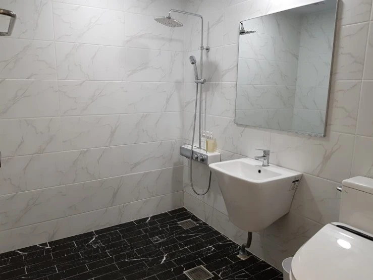 욕실에는 샴푸와 컨디셔너, 바디워시가 리필형 용기로 비치돼 있다. 4인 가족이 써도 넉넉한 용량이다. 칫솔과 치약, 세안제 등 개인 위생용품도 완비했다. 수건도 물론. 필요하면 추가 요청도 가능하다.