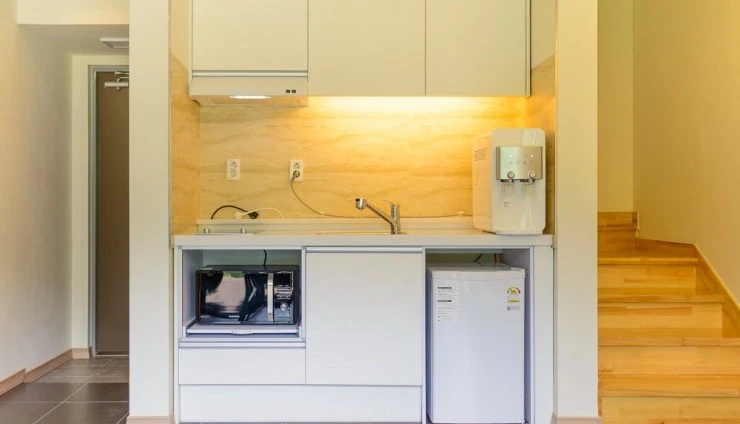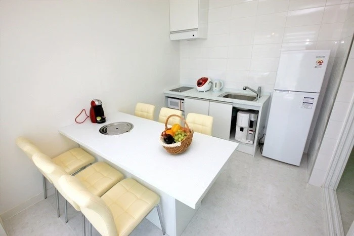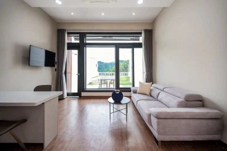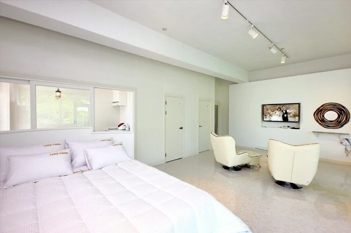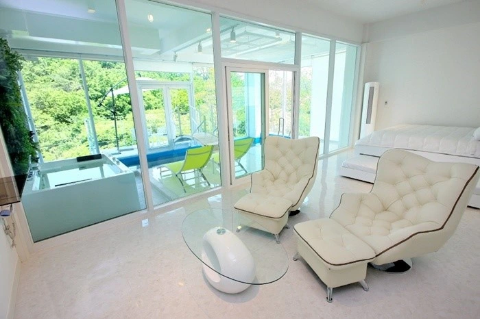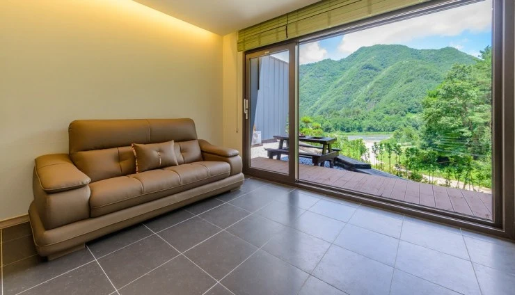 화이트톤의 객실은 넓고 깔끔해요. 넓은 통창으로는 막힘없는 마운틴뷰가 펼쳐진다. 객실 내 취사가 가능하며 정수기와 커피 머신, 조미료까지 완비되어 있다. WII 게임기도 있어 즐거운 시간을 보낼 수 있다.