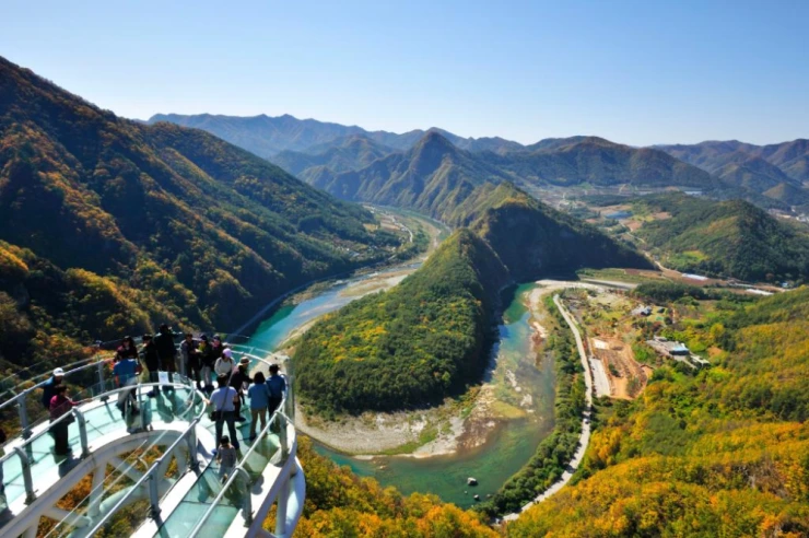 병방치 스카이워크는 정선에 갔다면 꼭 들러야 할 필수 관광지이다! 아찔한 유리 전망대에서는 한반도 지형을 닮은 동강변을 감상할 수 있다. 좀 더 강렬한 자극을 원한다면 짚와이어 체험도 즐길 수 있다.