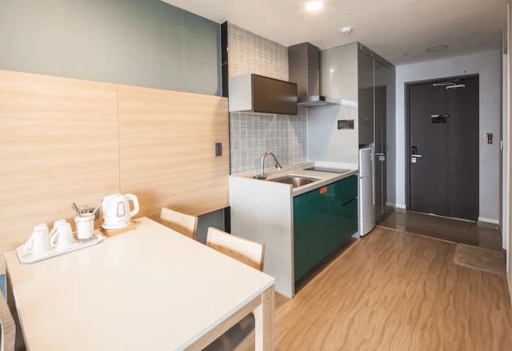 취사형 리조트 객실에는 내 집 부럽지 않은 주방을 갖췄다. 전기쿡탑과 밥솥, 전기포트, 냉장고를 포함해 각종 취사 및 식기류를 구비했다. 그릇과 접시, 수저, 식도, 도마, 냄비, 후라이팬 등 없는 게 없다.
