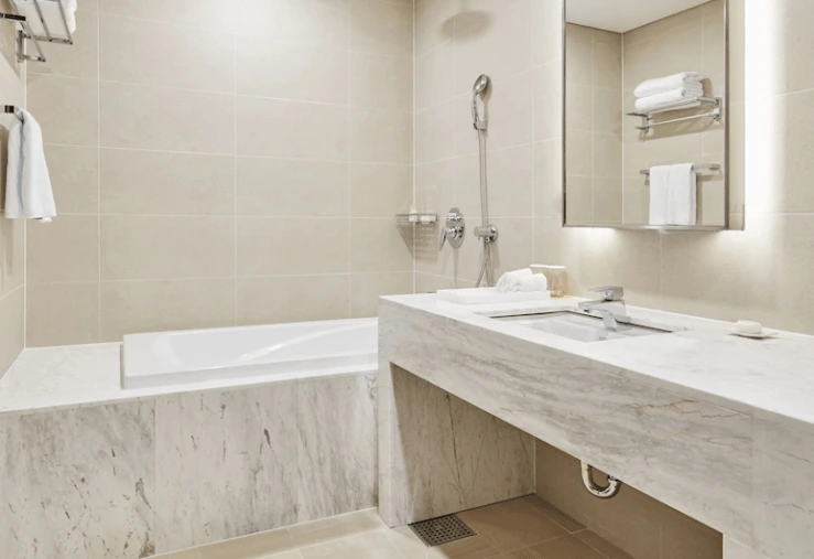 욕실 어메니티로 샴푸와 린스, 바디샤워젤, 비누가 제공된다. 개인 위생용품으로는 칫솔과 치약, 코튼 세트, 면도기, 빗, 목욕 가운, 페이스 타월, 베스 타월, 헤어드라이어를 준비해준다. 두 손 가볍게 오시면 된다.