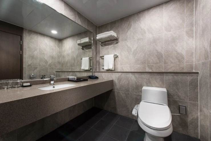 욕실에는 비데가 설치돼 있습니다. 지난해부터 샴푸와 컨디셔너, 바디워시, 핸드워시 모두를 친환경 다회용 제품으로 제공 중이다. 칫솔과 치약 등 일회용품은 호텔 내 자판기에서 구매 가능하다.