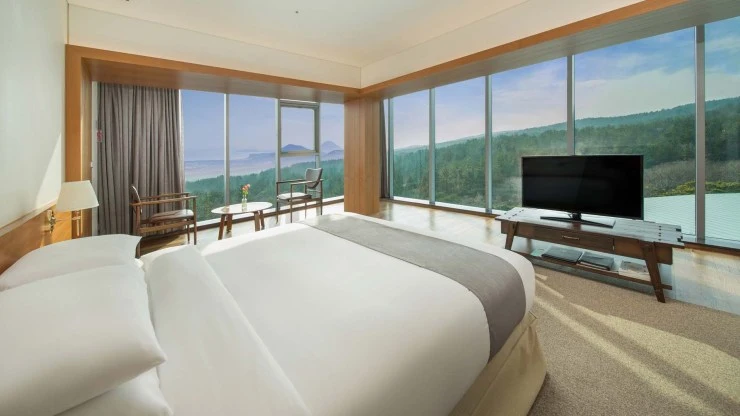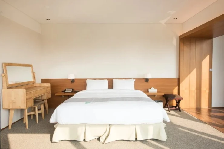 위 호텔의 디럭스룸은 여유로운 객실 크기와 2면이 통창으로 디자인돼 마라도와 가파도, 송악산, 산방산 그리고 바다와 산까지 조망할 수 있는 환상적인 뷰를 자랑한다. 화이트 & 우드톤으로 포근하고 편안한 느낌을 선사하는데, 통창으로 햇빛이 드리우면 더욱 포근하게 느껴진다.
