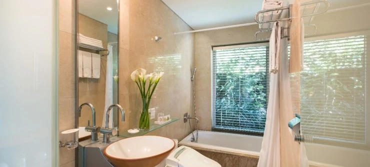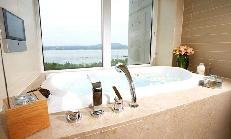 제주 숙소 휘닉스 섭지코지는 욕실에서도 멋진 뷰를 감상할 수 있다. 욕조에 몸을 담그면 쪽빛 바다와 성산일출봉이 보인다. 어메니티로는 샴푸, 컨디셔너, 샤워젤, 비누, 수건, 헤어드라이어가 구비되어 있다. 치약과 칫솔, 면도기, 클렌징폼 등은 개별적으로 챙겨 와야 한다.