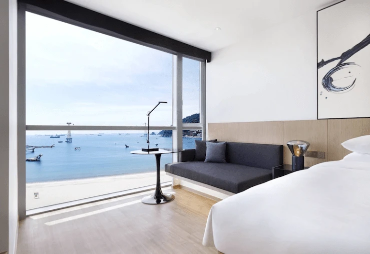 지난해 문을 연 페어필드 바이 메리어트 송도 호텔은 신축 숙소답게 깔끔한 외관을 자랑한다. 내부는 미니멀리즘 한 감성으로 꾸며졌다. 모든 객실에서 통유리를 통해 도보 1분 거리인 송도 해수욕장과 바다를 조망할 수 있다.