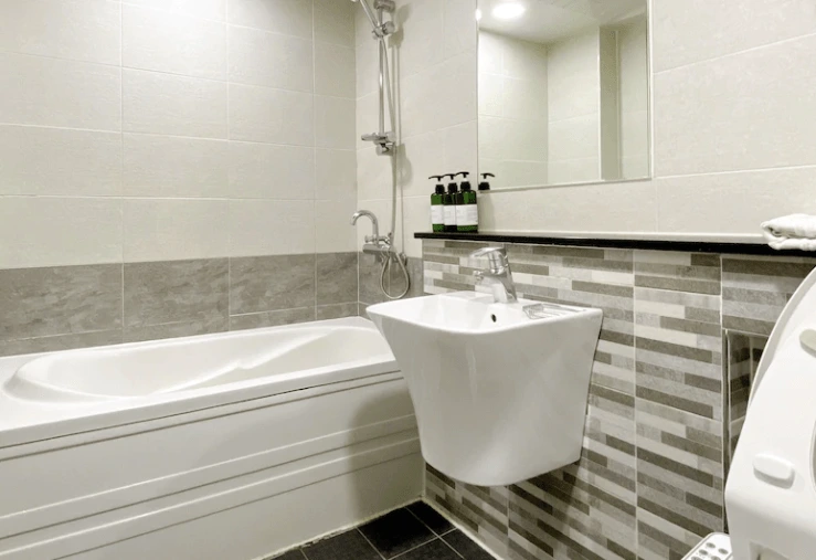 욕실에는 샴푸와 린스, 바디워시가 리필형으로 제공된다. 일회용품으로는 칫솔과 치약, 면도기, 빗, 면봉, 클렌징폼, 스킨, 로션 등을 준비해준다. 헤어드라이어는 침실 벽면에 부착돼 있다.