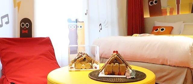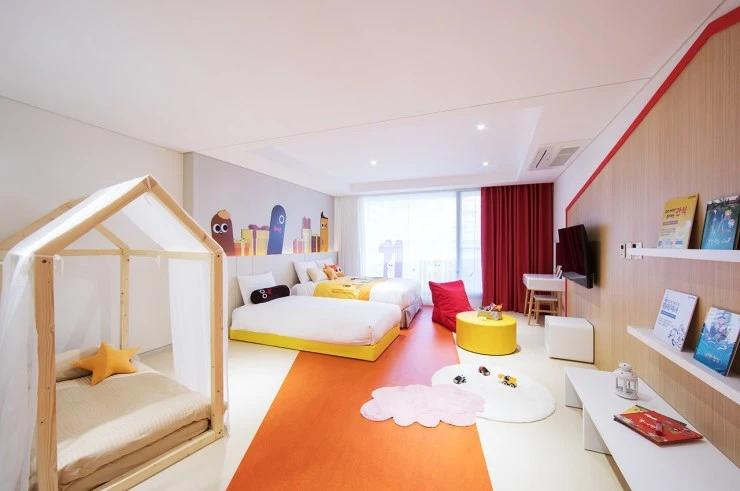 빼빼로 객실도 동일한 구조이며, 발랄한 디자인이 아이들을 반긴다. 베드는 더블+싱글베드 구성으로 최대 4인까지만 숙박이 가능하다.