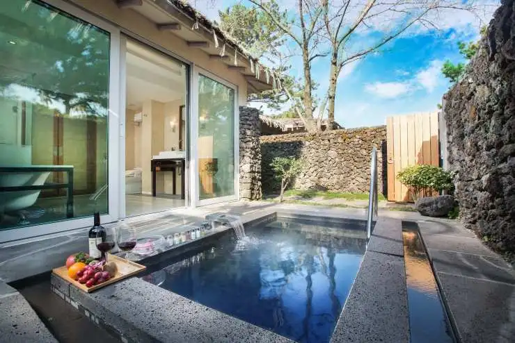 이중 허니문 빌라는 제주 신혼여행 숙소 목적으로 찾은 커플에게 인기가 높다. 침실과 거실 및 주방, 욕실, 화장실, 월풀 욕조, 개별 수영장을 갖췄다.