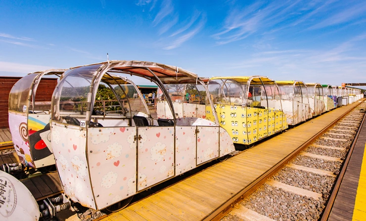 구좌읍 주변 오름과 우도, 성산일출봉까지 조망할 수 있는 레일바이크는 데이트 코스로 빼놓을 수 없다. 매 시간 정시부터 30분 간격으로 운행 중이다. 완주하는 데는 약 35분 가량 소요된다.