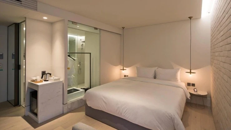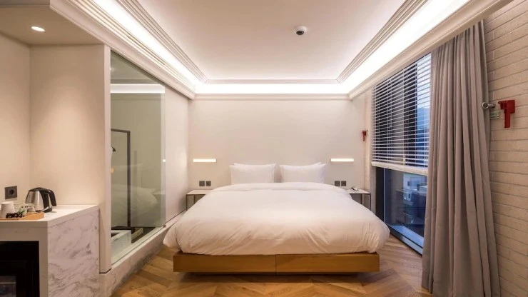 콘트 호텔의 슈페리어 더블룸은 널찍한 원목 침대와 네이비 컬러의 패브릭 소파, 테이블 등이 조화롭게 배치되어 감각적인 인테리어가 눈에 띈다. 침실에는 자연광이 드리우는 창가가 준비돼 시티뷰를 감상하기도 제격이다. 그 밖에도 냉장고 겸 미니바, 전기 포트 등이 준비되어 있다.