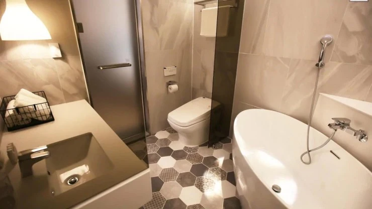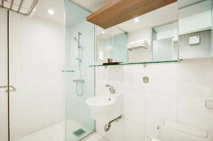 욕실은 깔끔한 샤워부스가 설치되어 있다. 어메니티로 샴푸, 컨디셔너, 바디워시, 바디로션, 비누, 샤워캡, 면봉, 화장솜, 샤워 스펀지, 빗 등이 준비된다. 칫솔과 치약은 제공되지 않으니 개별적으로 준비하시거나 로비 자판기에서 구매하면 된다.