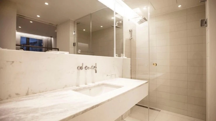 스위트 시티뷰 욕실에는 욕조와 변기, 세면대가 각각 분리된 형태로 준비되어 있다. 어메니티로는 샴푸, 컨디셔너, 바디워시, 바디로션, 비누, 수건, 헤어드라이어 등이 준비된다.