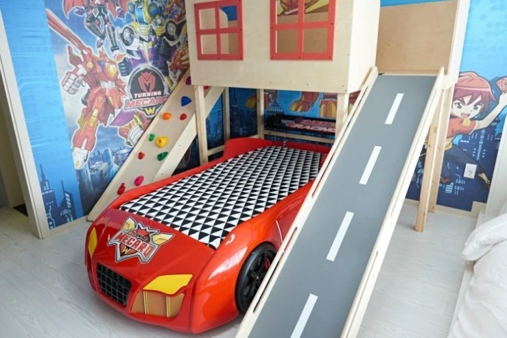 뉴캐릭터룸에는 부모님을 위한 더블베드와 아이들을 위한 캐릭터 베드가 준비되어 있다. 놀이시설도 잘 갖춰져 있어 키즈카페 부럽지 않다.