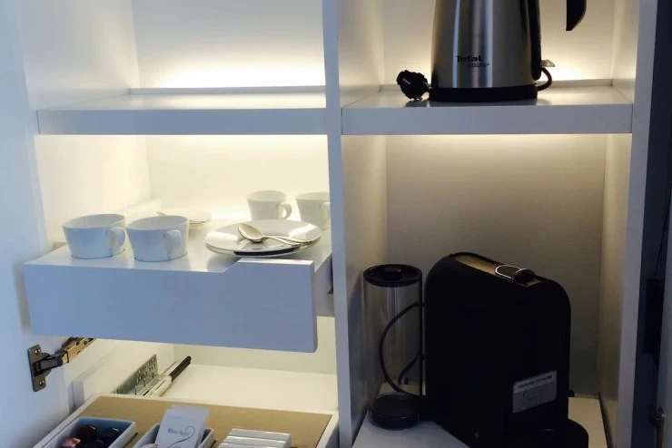객실 내 비치된 미니바는 1회에 한해 무료로 이용 가능하다. 커피 머신도 비치돼 있어 멀리 나갈 필요가 없다.