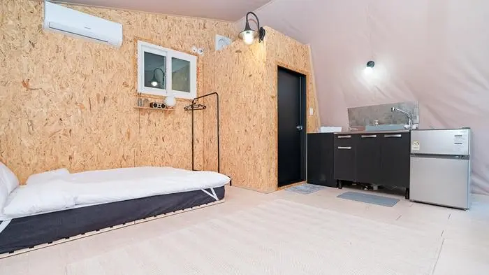 독채 원룸형으로 개별 주방과 화장실까지 모두 갖춰 편리하게 사용할 수 있다. 그뿐만이 아니라 빔프로젝터, 온풍기, 전기장판, 바닥난방, 드라이기, 고데기 등이 구비되어 있어 캠핑의 불편함은 완전히 잊고 자연 속에서 편안한 시간 보낼 수 있다.