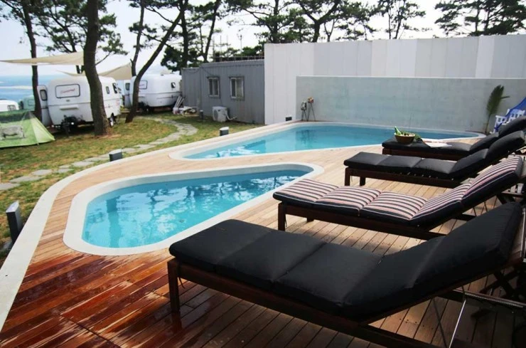 두 번째로 소개할 곳은 사천에 있는 비토애 글램핑 캠핑장이다. 비토애 글램핑의 가장 큰 장점은 사계절 내내 온수로 이용 가능한 인피니티풀이 있다! 풀장 주변에는 라탄 파라솔과 선베드가 있어 해외여행 온 듯 감성 가득한 인생샷 건질 수 있다.