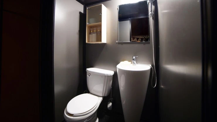 간단한 주방시설과 냉장고, 개별 데크까지 준비되어 바비큐 파티도 즐기며 글램핑의 추억을 남기기에 딱 좋다! 개별 화장실 겸 샤워실도 모두 준비돼 있다.