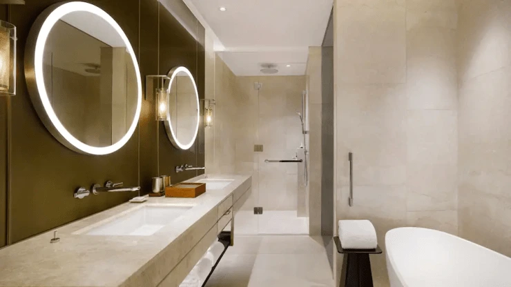 대리석 욕실에는 두 개의 세면대와 아일랜드 욕조, 샤워부스가 설치돼 있다. 어메니티로는 발망 제품이 제공된다. 칫솔과 치약, 쉐이빙 키트, 화장솜, 면봉, 소독 티슈 등 일회용품도 완비했다.