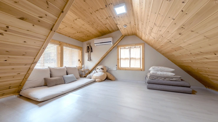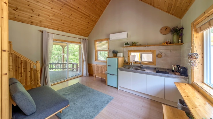 옐로우 동은 아늑한 다락방이 있는 복층 객실이다. 숲속 오두막에 온 듯 따뜻하고 포근한 느낌이 가득한 감성숙소이다. 넓은 창문 가득 힐링 마운틴 뷰도 즐길 수 있다. 객실 내 취사 가능하며 커피 머신도 준비돼 있다.