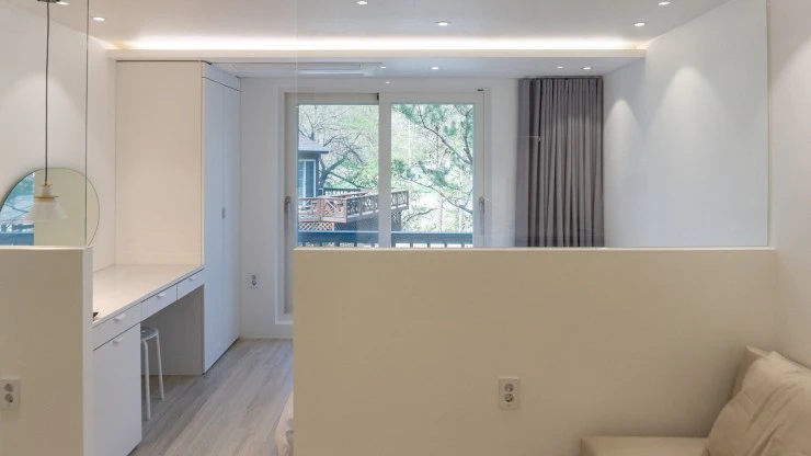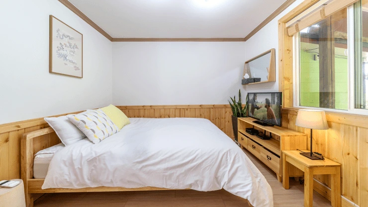 거실과 침실이 분리된 구조로 커플 여행 감성숙소로 딱이다. 거실에는 스마트 TV가 있어 넷플릭스와 유튜브, 왓챠 등의 스트리밍 서비스도 이용할 수 있다. 야외 테라스도 있어 프라이빗한 시간을 보낼 수 있다.
