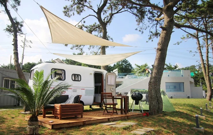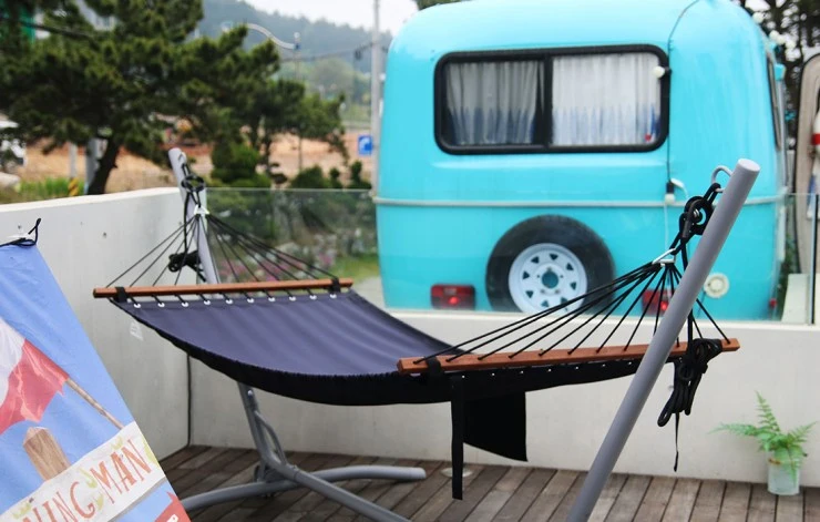 객실마다 개성 넘치는 휴식 시설을 갖췄다. 해먹과 놀이 텐트, 카바나, 흔들의자, 클래식 카 등 다채로롭다. 감성 카라반 홀스 7호 객실에서는 루프탑 전체를 단독으로 사용할 수도 있다.