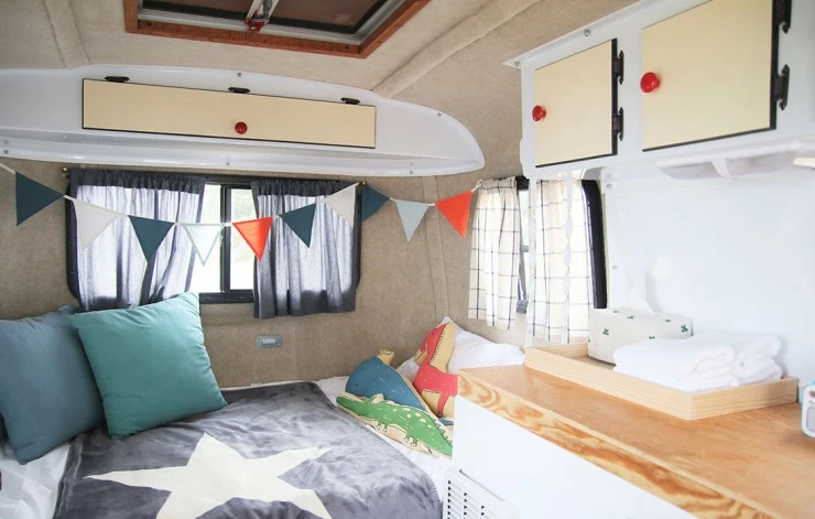 작고 귀여운 외형이 인상적인 더무빙카라반 객실은 100% 수제로 제작됐다. 100년 넘는 역사를 가진 미국 전통 카라반이다. 실내는 아기자기한 감성으로 꾸며놨다. 계절에 따라 달라지는 꽃 장식도 인상적이다.