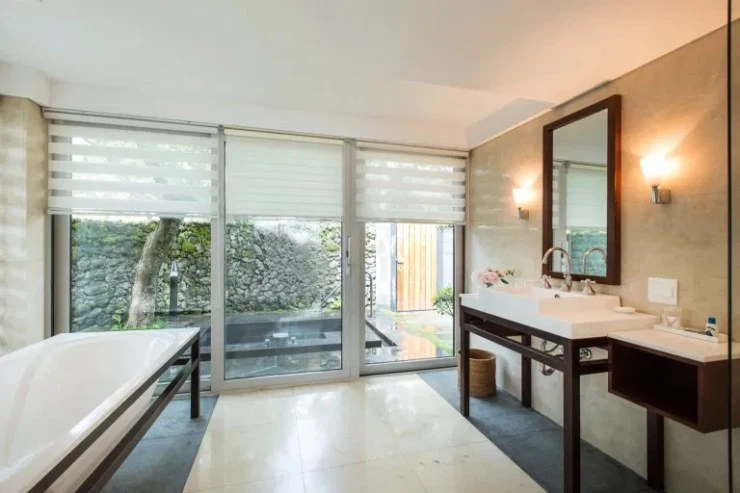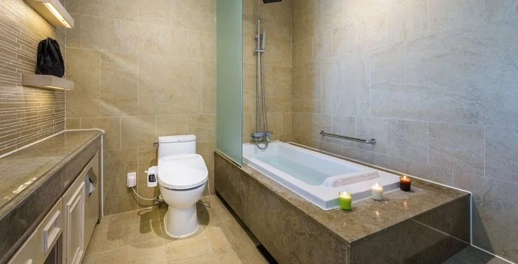 대리석으로 지어진 욕실에는 욕조와 비데 그리고 널찍한 세면데까지 설치되어 있다. 어메니티로는 샴푸, 린스, 바디워시, 바디로션을 비롯한 목욕가운, 수건, 비누, 치약, 칫솔, 면도기, 드라이기, 면봉, 화장솜, 빗, 샤워캡 등 세심하게 준비되어 있다.