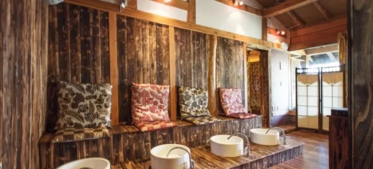 야외 노천탕과 이어진 욕실에는 욕조가 설치되어 있고, 어메니티로는 샴푸, 린스, 바디워시, 비누, 목욕 가운, 수건, 샤워캡, 면봉, 화장솜, 헤어드라이어 등이 준비되어 있다.