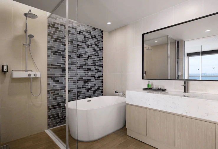 1층 로비는 감각적으로 꾸며져 사진 찍기 좋다. 전체 페어필드 바이메리어트 송도 부대 시설로는 갤러리 카페와 코인 세탁실, 피트니스 센터, 루프탑, 회의실을 갖췄다. 같은 건물에 편의점도 자리했다.