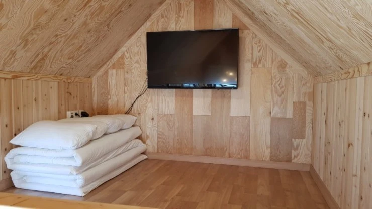 군산 숙소 선유도에 물들다 펜션은 객실에서 평화로운 선유도 바다를 볼 수 있는 매력적이다. 복층 구조로 된 원목 인테리어가 따뜻한 분위기가 물씬 풍긴다. 1층은 주방과 화장실이, 2층에는 따뜻한 온돌방이 마련되어 있다.