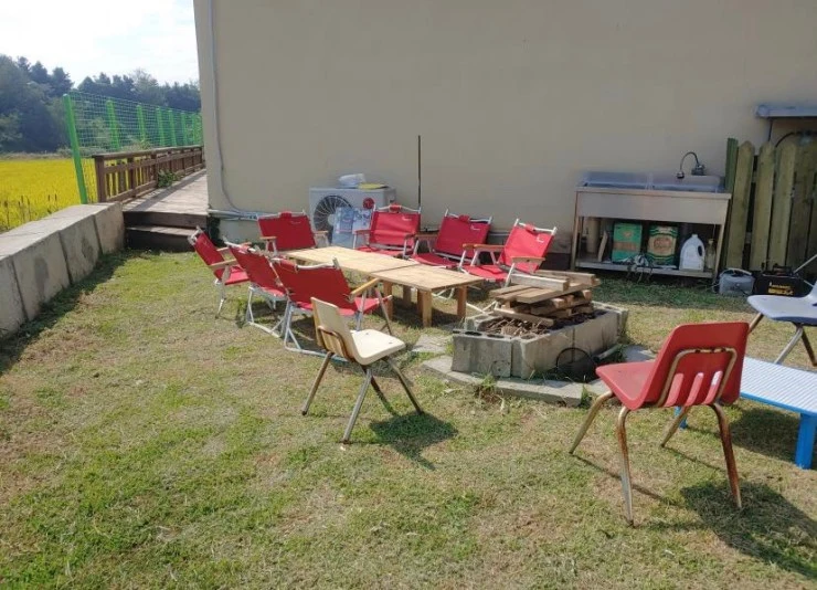 앞마당에 가족과 함께 바비큐를 즐길 수 있도록 바비큐 시설이 준비되어 있다. 5만 원만 추가해 주시면 테이블, 의자, 석쇠, 장갑, 조명, 도구 및 1회 용품& 장작 10kg 이 제공된다. 심지어 바비큐를 이용하실 경우 앞마당 텃밭을 무료로 이용할 수 있어 고기만 구입해서 오면 된다.