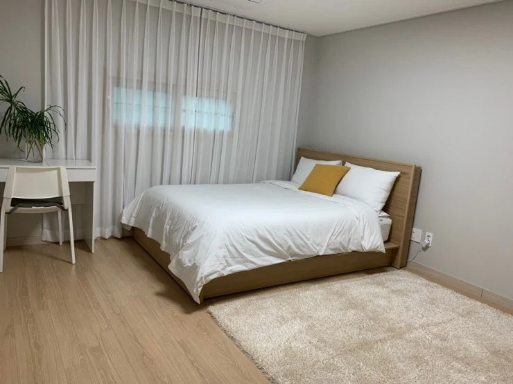 침실은 총 3개로 2개는 침대 룸, 1개는 온돌룸이다. 침대와 함께 테이블, 수납장 등 깔끔하면서도 필수적인 가구들로 간결하게 꾸며져 있다. 그뿐만이 아니라 대흘리에의 정원이 내려다보이는 테라스가 준비돼 있다요. 사계절에 따라 변화하는 제주도의 멋진 풍경을 감상할 수 있으니 이곳에서 향긋한 티 한 잔 마시며 잠시 여유를 즐겨 보자.