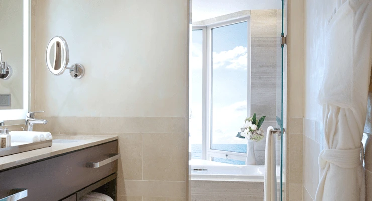 욕실에는 샴푸와 컨디셔너, 바디워시, 바디로션, 비누가 제공된다. 칫솔과 치약, 면봉, 샤워캡, 빗, 목욕 가운, 수건 등 개인 위생용품도 부족함 없이 챙겨준다. 이외 아로마 바스 쏠트와 헤어드라이어를 비치해 놨다.