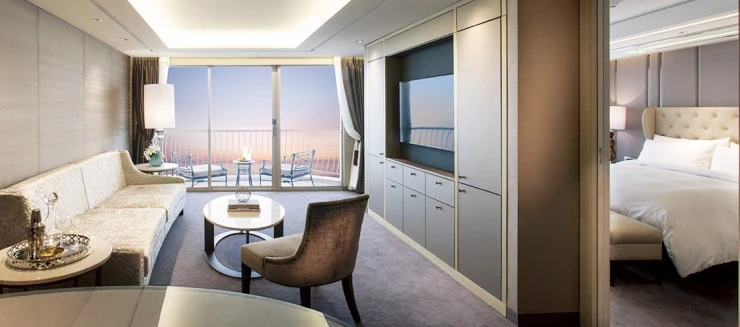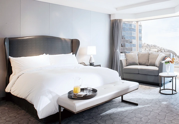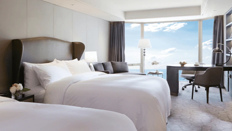프리미엄 룸은 부산 파라다이스 호텔 신관 대표 오션뷰 객실이에요. 달맞이 고개에서 동백섬까지, 끝없이 펼쳐진 해운대 해변의 아름다움을 감상해보세요. 침대 타입은 더블과 트윈 중에 선택할 수 있다.