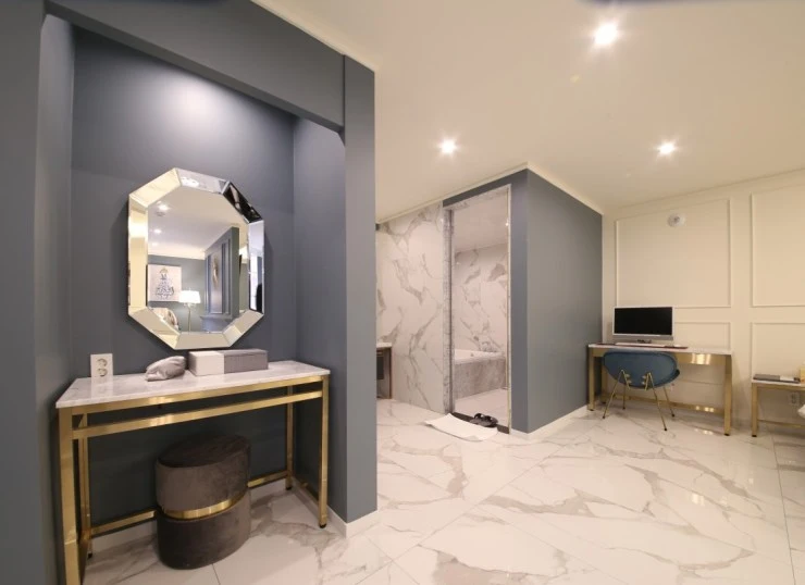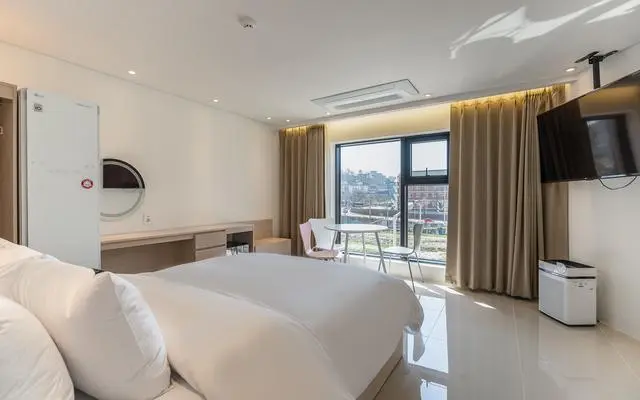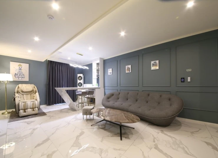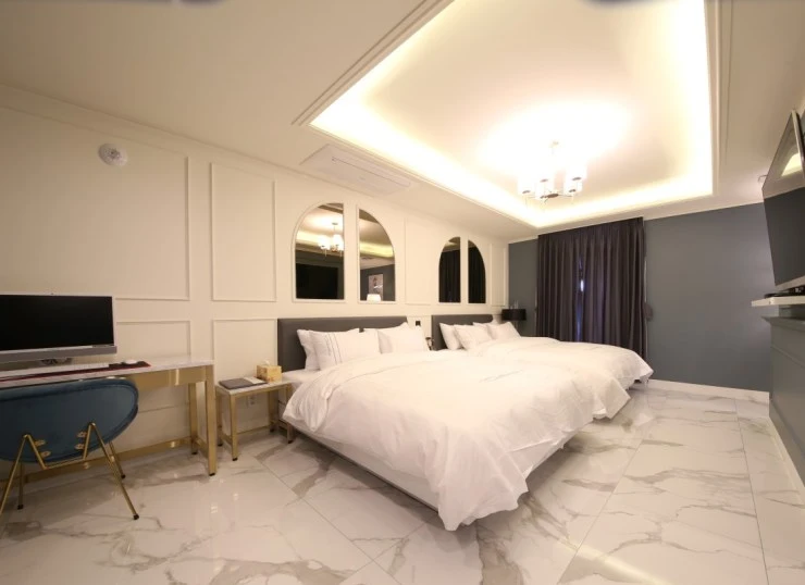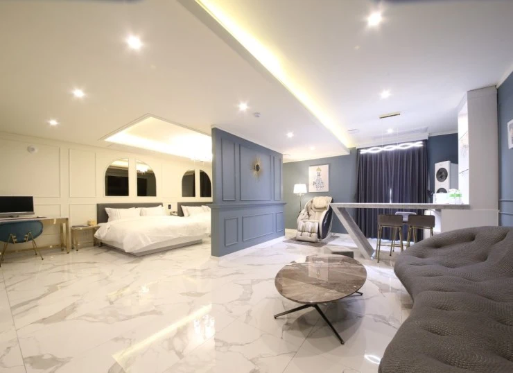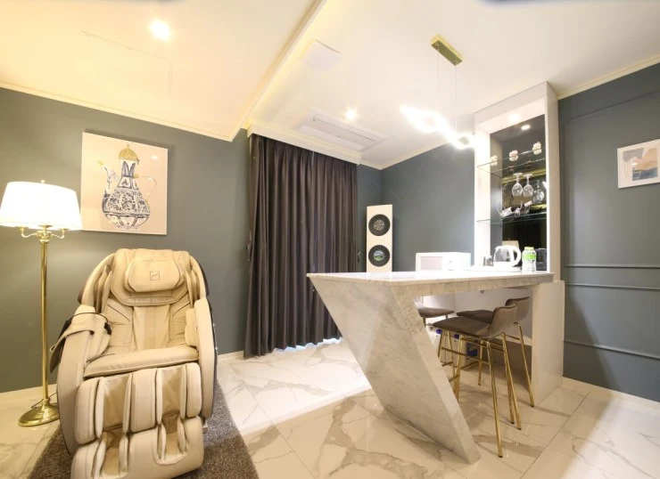 럭셔리 객실은 26평의 넓은 면적을 자랑한다. 모던하고 세련된 인테리어로 사진 찍기에도 좋다! LG 스타일러와 공기청정기, 안마의자 등도 있어 호캉스에 제격이다. 미니바도 있어 기분 내기 딱 좋다.