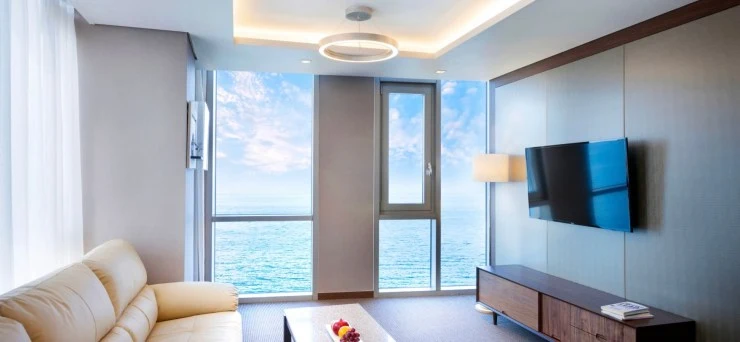 제주 공항과 편리한 접근성을 자랑하는 제주 리젠트마린호텔! 차량 이동 시 단 15분 정도면 도착할 수 있으며 버스 이용 시에는 30분 내로 도착할 수 있어 뚜벅이 여행자들이 선호하는 숙소이다. 착한 가격대지만 외관과 내부 모두 깔끔하고 세련돼 호캉스 기분 제대로 낼 수 있다.