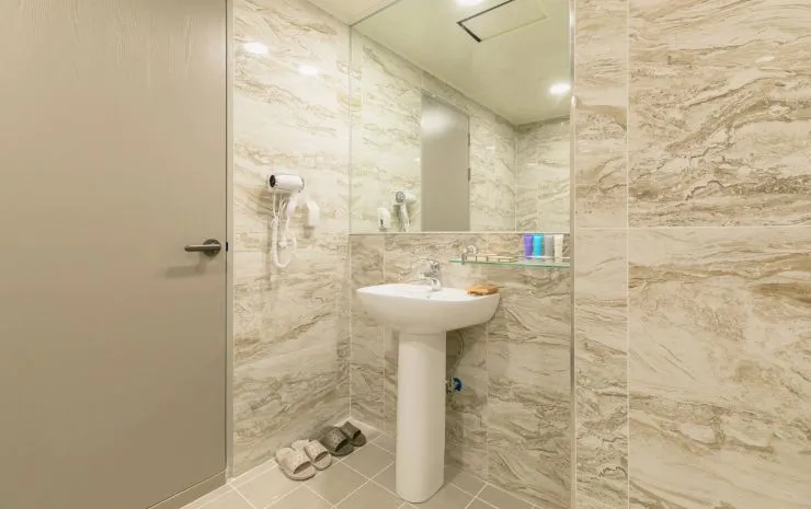 욕실 어메니티로 샴푸와 린스, 바디워시, 비누가 제공된다. 이와 함께, 수건과 욕실화, 헤어드라이어가 비치돼 있다. 칫솔과 치약 등 개인 위생용품은 따로 챙겨와야 한다. 깜박했다면, 편의점을 이용해보자.