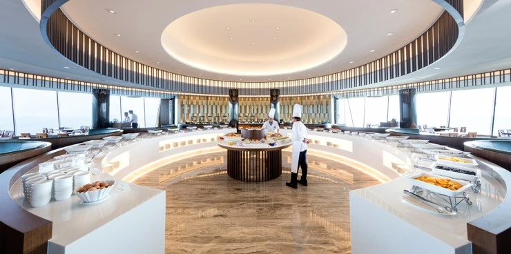 조식은 썬크루즈 8층 레스토랑에서 오전 7시부터 10시 30분까지 뷔페로 운영된다. 종류가 많아 대체로 호평이다. 키즈 식기류도 갖췄다. 창가 자리를 선점하려면, 이른 시간대에 움직여야 한다.