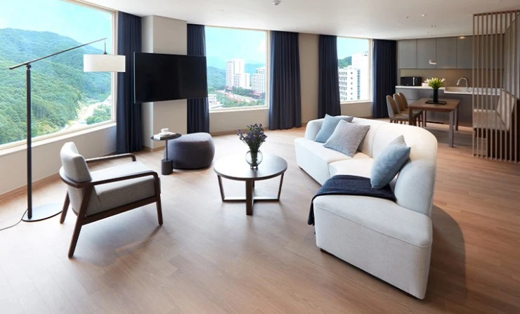 객실은 리조트와 호텔, 노블리안, 레지던스(구 빨라시오) 타입으로 나뉜다. 가족이라면 주방을 갖춘 리조트형 객실을 추천한다. 스위트 기준 침실과 욕실 각 2개와 거실로 구성됐다. 창밖에는 동해가 한눈에 들어온다.