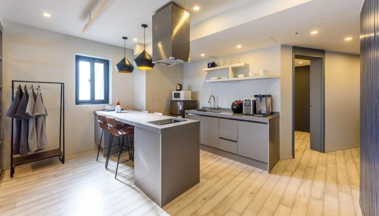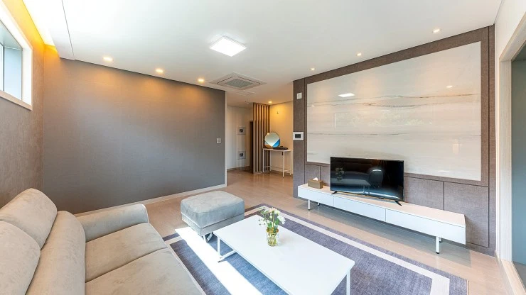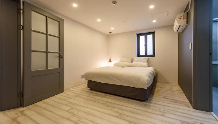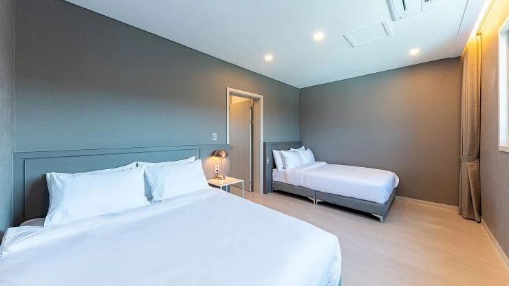 거실과 침실로 구성되어 있으며 최대 6명까지 숙박이 가능하다. 침실은 트윈베드가 들어가고도 여유로워 편하게 머물 수 있다. 객실 내 취사 가능하며 에어프라이어도 있어 편리하다.