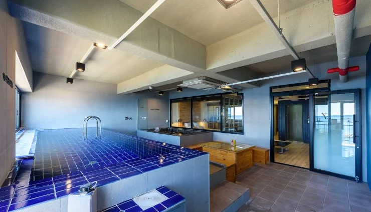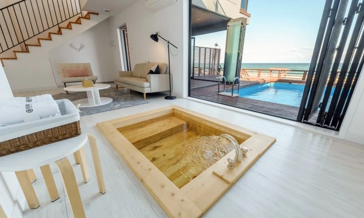 올스테이가 이 객실을 선택한 이유는 귀여운 히노끼탕이 있기 때문이다! 수영장에서 이어지는 거실에서 따뜻한 스파를 즐길 수 있어 실용적이다.