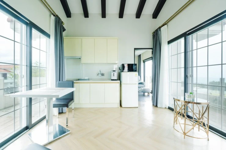 이곳은 전 객실 프라이빗한 독채 구조와 침실과 거실이 분리되어 있고, 객실 내에서 취사가 가능하도록 각종 주방도구와 식기류가 갖추어져 있어 한 달 살이에 부족함이 없다.