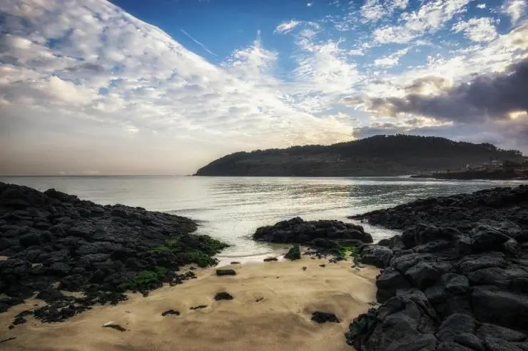 다음으로 소개해 드릴 곳은 에메랄드 빛 바닷물이 매력적인 함덕 해수욕장이다. 푸른 하늘과 검은 돌과 어우러져 더 빛을 발하는 곳이다. 수심이 깊이 않아 여름철에는 물놀이 하기에도 좋다. 노을이 아름다워 백사장에 앉아 물멍 하기에도 더없이 좋은 곳이기도 하다.