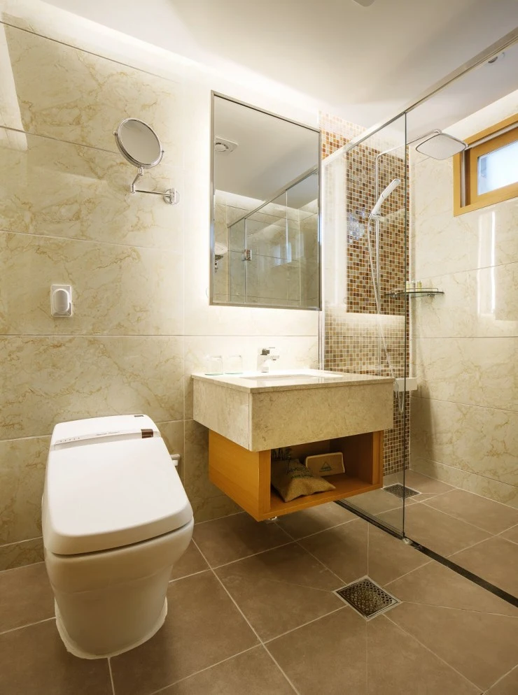 샤워부스가 설치된 욕실은 넓고 깔끔한 편이다. 더욱 만족스러운 점은 명품 브랜드 불가리 세면 용품이 어메니티로 제공된다! 샴푸, 린스, 바디워시, 치약과 칫솔, 수건, 헤어 드라이어가 모두 준비되어 있다. 그뿐만이 아니라 청소 서비스도 매일 제공되니 어메니티가 부족하다면 그때그때 추가로 요청하면되니 편리하게 이용해 보자.