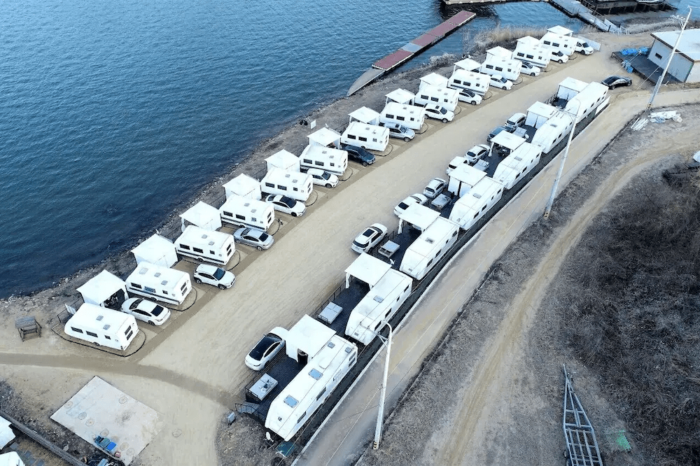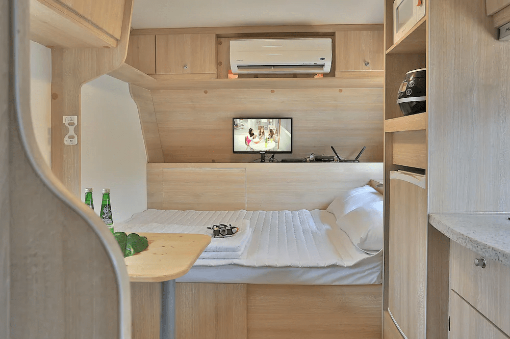 전망 좋은 가평 포세이돈 카라반 객실을 찾는다면 R존을 추천한다. 바로 앞에 호수를 마주해서, 뷰가 환상적이다. 내부는 침실과 주방, 욕실로 구성되어 있고, 침대와 에어컨, TV, Wi-Fi 등이 완비되어 있다.