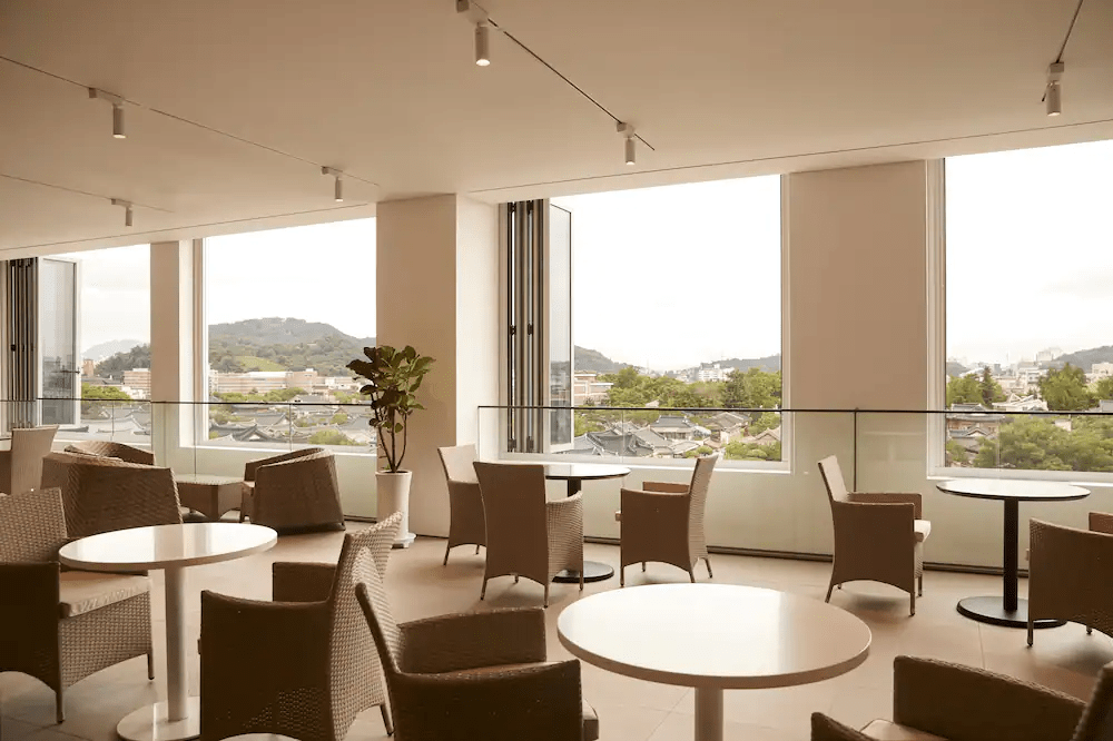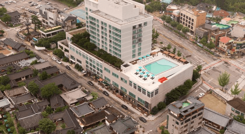 화이트톤 외관은 모던하고 깔끔한 인상을 준다. 주변 한옥마을 기와와도 조화롭게 어울린다. 월넛 브라운과 페일 그레이를 바탕으로 디자인된 객실은 부드럽고 따뜻한 분위기로 휴식 취하기 좋다.